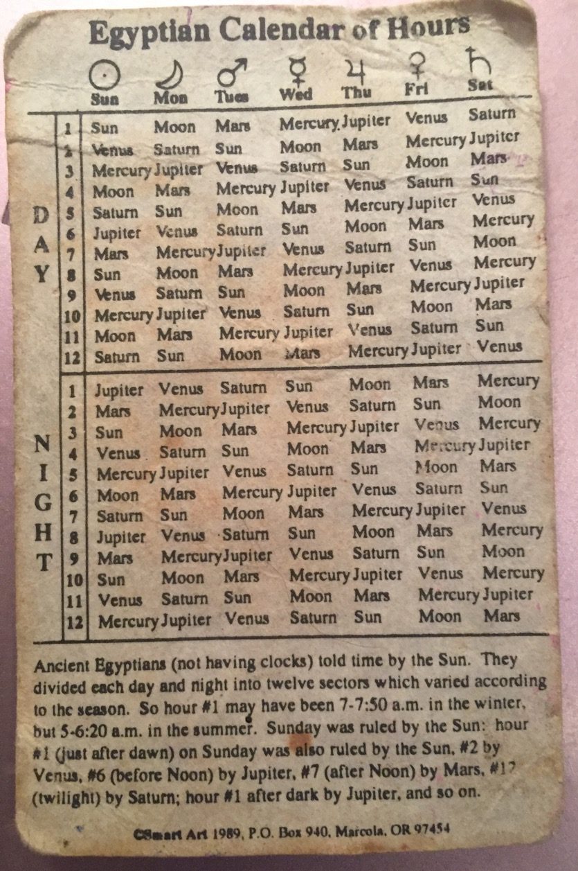 So yeah and then just for the fun of it I threw in the Egyptian calendar of hours. My Egyptian guide wonderful beautiful Marianne was like ‘I’ve never seen that, let me take a photo, Oh interesting’ she being a Coptic Christian, but a great guide into the Egyptian historic, powers of Lucor And the Valley of the Kings and Queens and Temple of Hatshepsut – she was like ‘well that’s really interesting.’ And we were talking astrology and she’s like ‘oh oh’ and talking about autonomy, and she’s like, ‘ah – yes!’ again these are radical ideas. And different forms of tyranny one doesn’t have to put up with. but I’ve been it so I I don’t even know I mean this little chart was published in. 1989 I must not have had it Longer than it was published, 1989 – but it’s a little piece of paper I’ve had in my wallet for the longest time, and I go yeah so I wrote this to us, it’s in the missive and I’ve been mis-using it, you know the hour is 1, 2, 3, – the first hour is the hour of sunrise and then each ensuing hour… You know we have Sun·day moon·day Mars·day Mercury (Jupiter’s·day) Friday (Venus·day) Saturday (Saturns·day) …we have a 7 day week because of 7 visible planets, that is the only reason, there are more accurate calendars, but that’s the only reason… to honor that quality of intelligence, and then within each day, each hour has a different planetary quality.