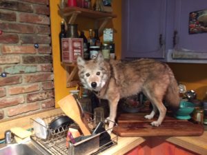 For years I didn’t have anything that wasn’t half eaten or destroyed… or just a moment of inattention, she’d be waiting for me to put the leather appointment book that she really wanted down unattended for a moment – then it was gone! Now and then you have to wheel and deal going, “If I give you this, then will you have this? How about this?’ It’s all telepathic negotiation because coyotes do not know shame nor can they be taught shame – we’ve taught dogs shame, and wolves can be like ‘uhhh ohh’…