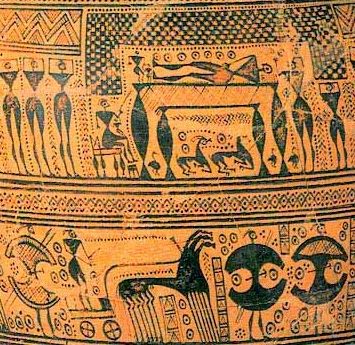 So Robinette continues and says, “In the National Archaeological Museum in Athens Greece there’s a huge funeral krater – a clay vessel seven fifty B.C. – found in an ancient Athens cemetery. Images painted on the outside of the krater of the body of a deceased person on a stretcher surrounded by women in the Psychopomp pose both seated and standing…” it’s one of the ones I sent you, everybody “in the background of the scene between the seated women and sister mourners are images of the sun with rays. The rays represent the sun’s regenerative aspect that will transform and revive the soul of the deceased in the land of the dead.”